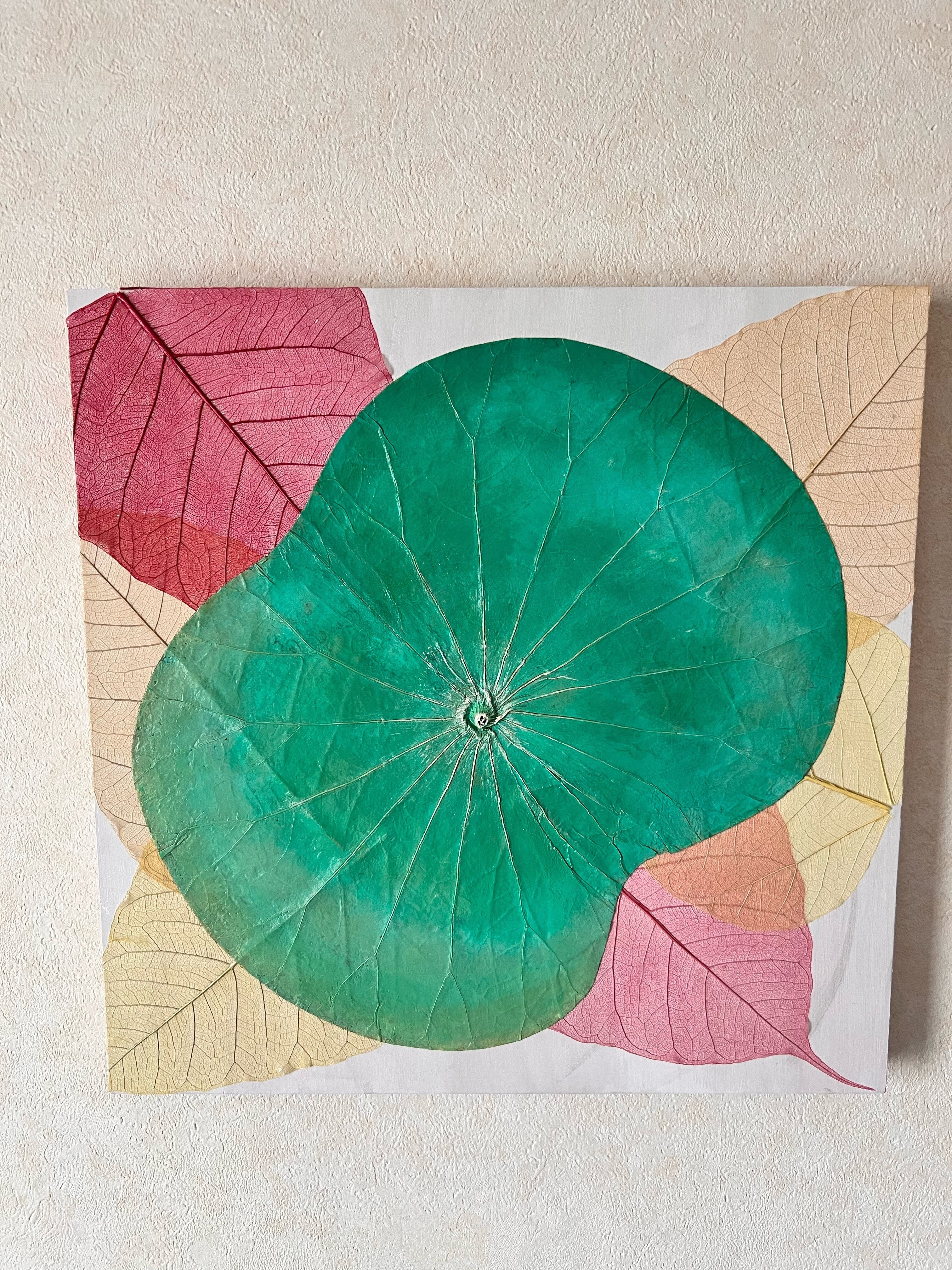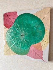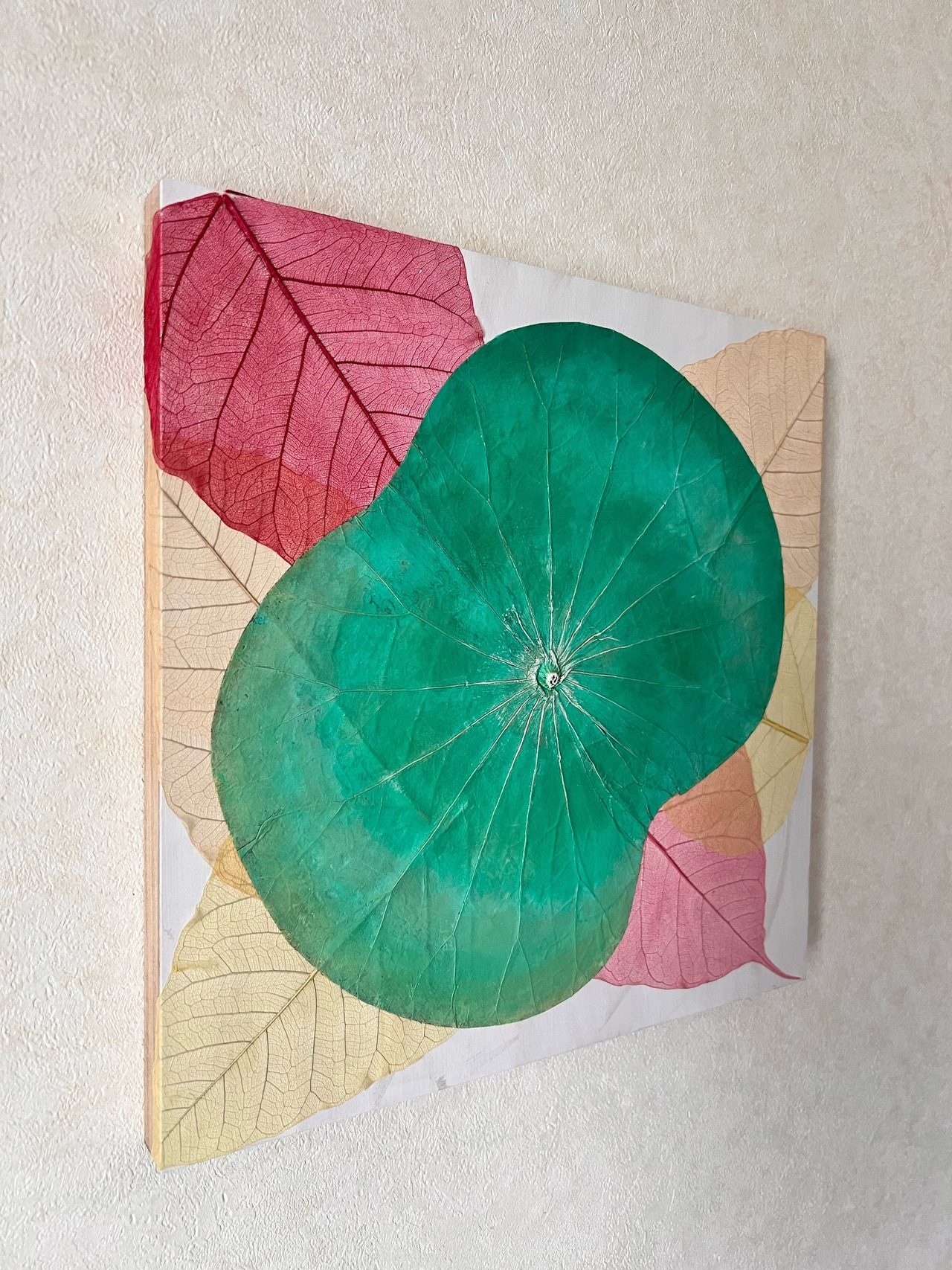 木製キャンバス地に天然の蓮の葉と菩提樹の葉を貼り、着色を施してます