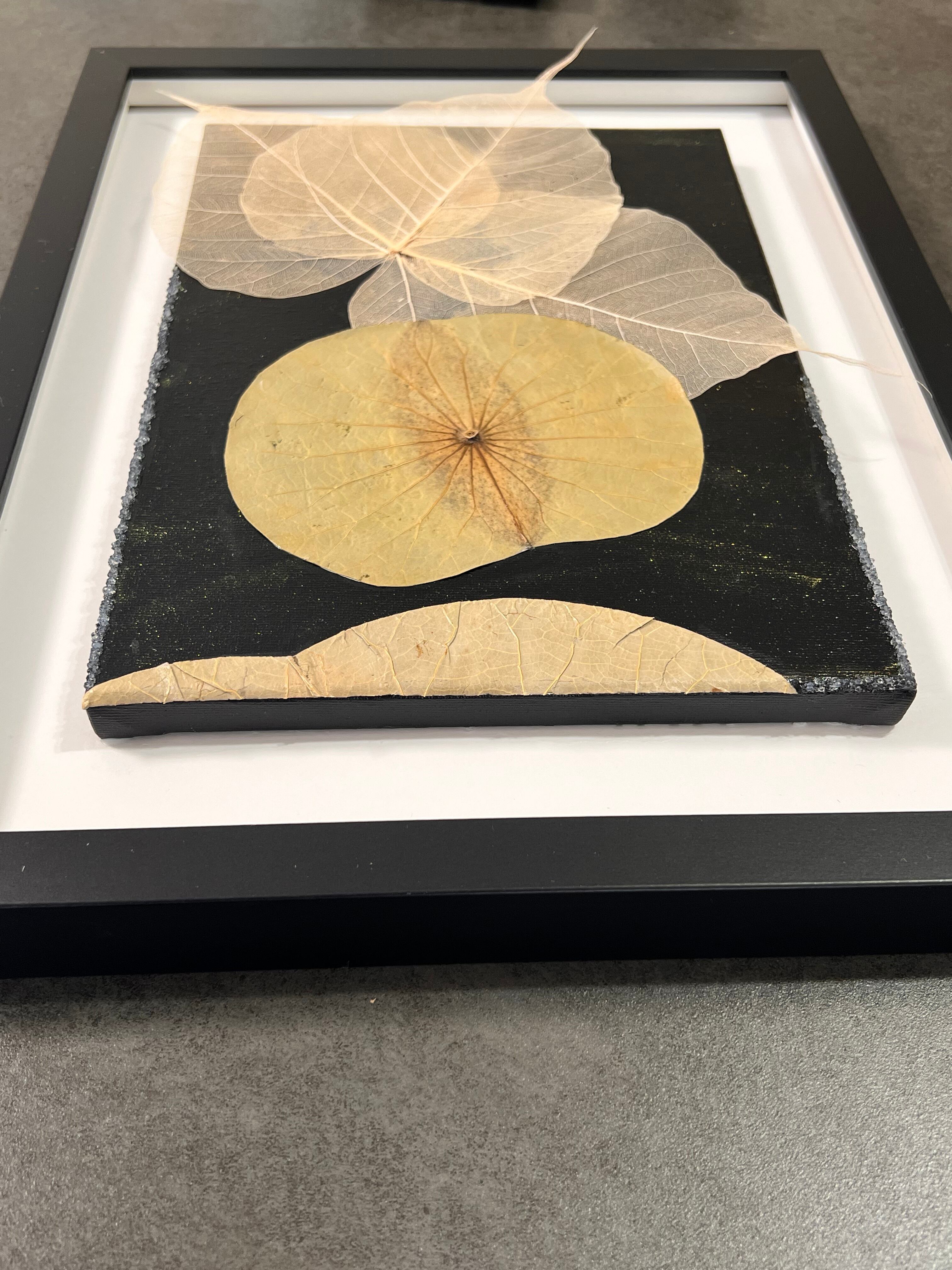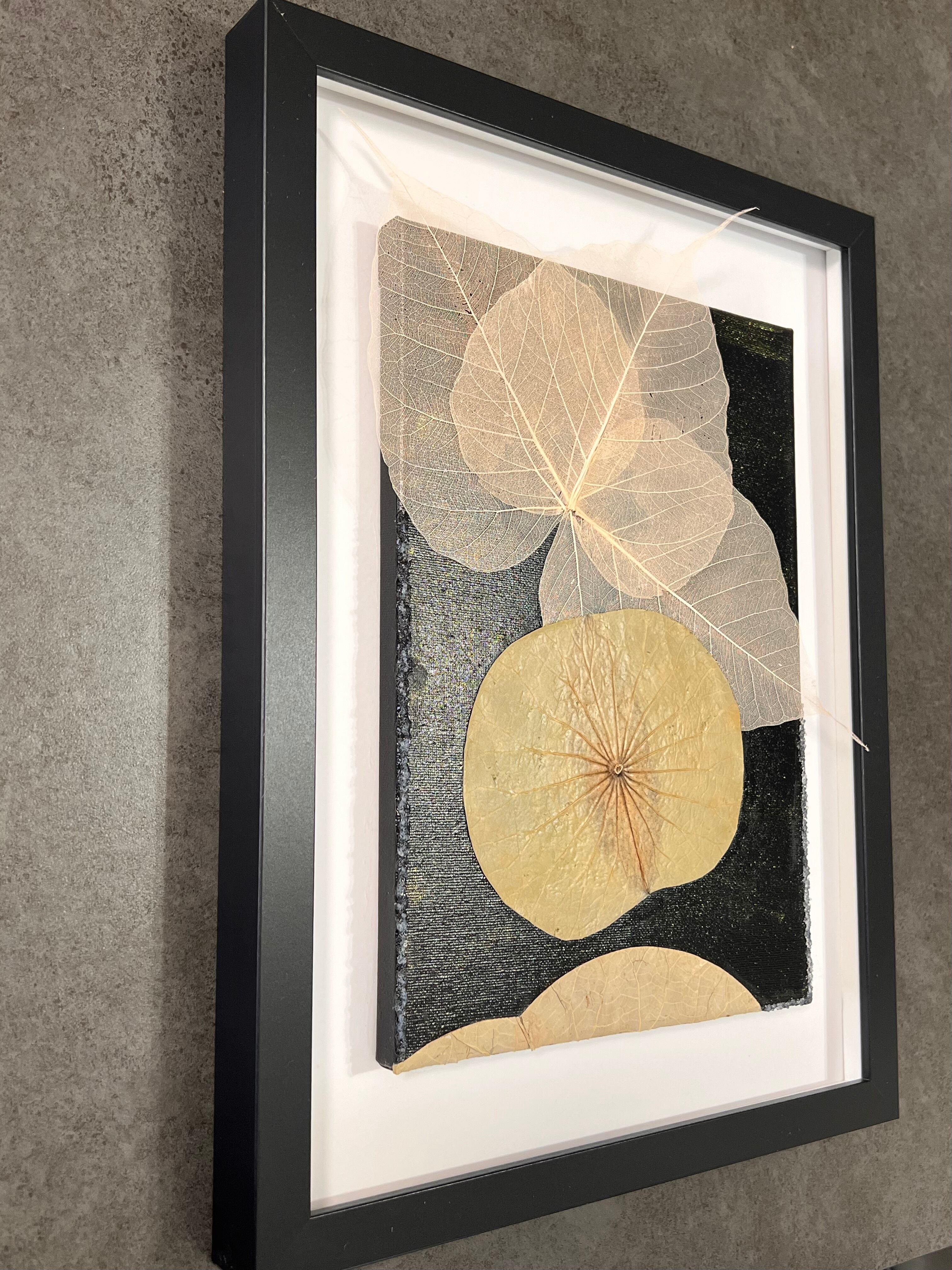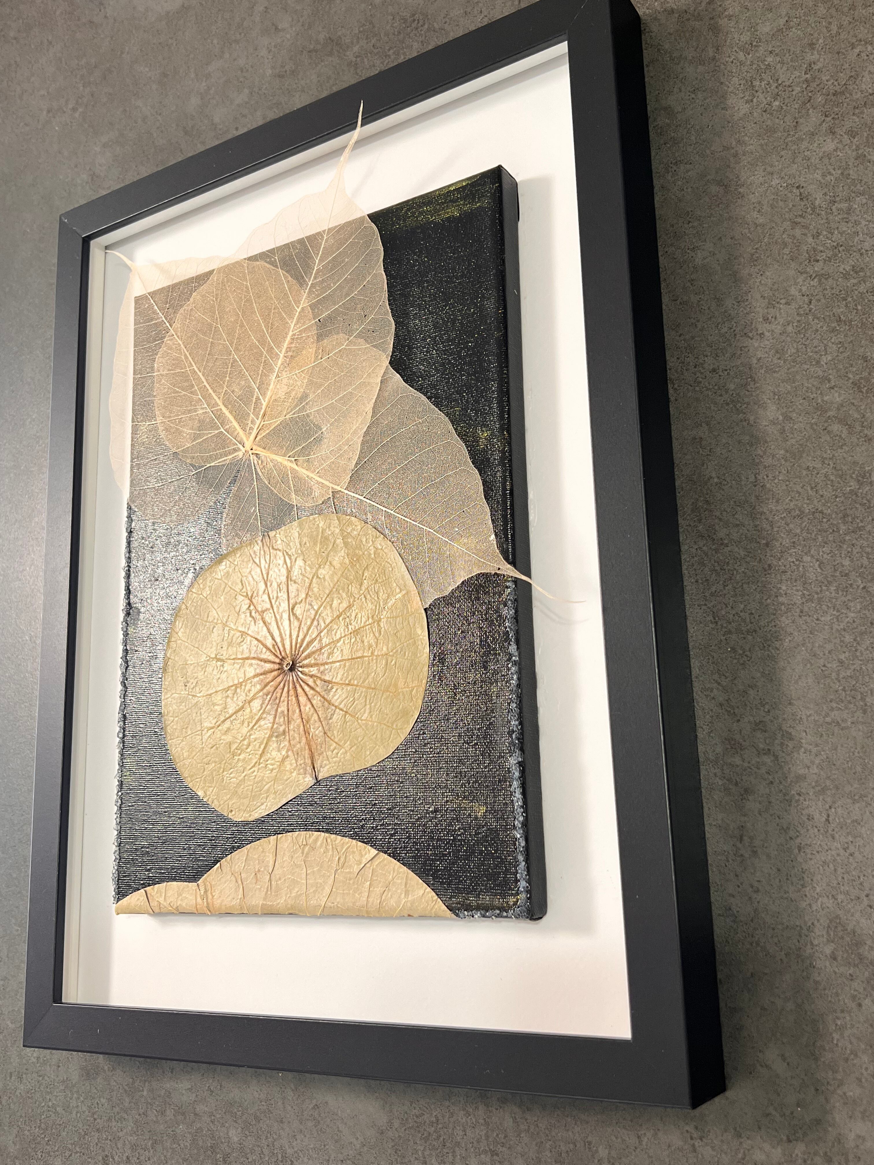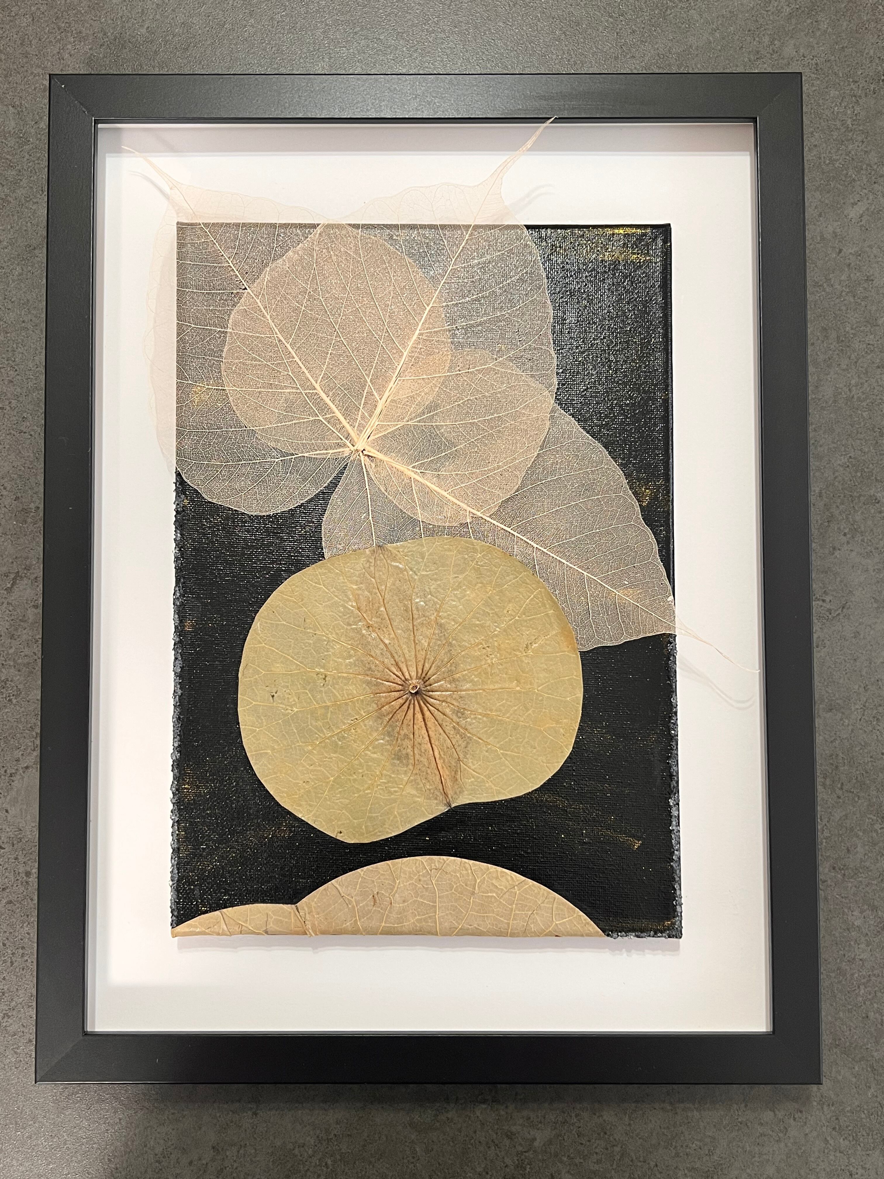 キャンバスに天然の蓮の葉と菩提樹の葉を貼り、