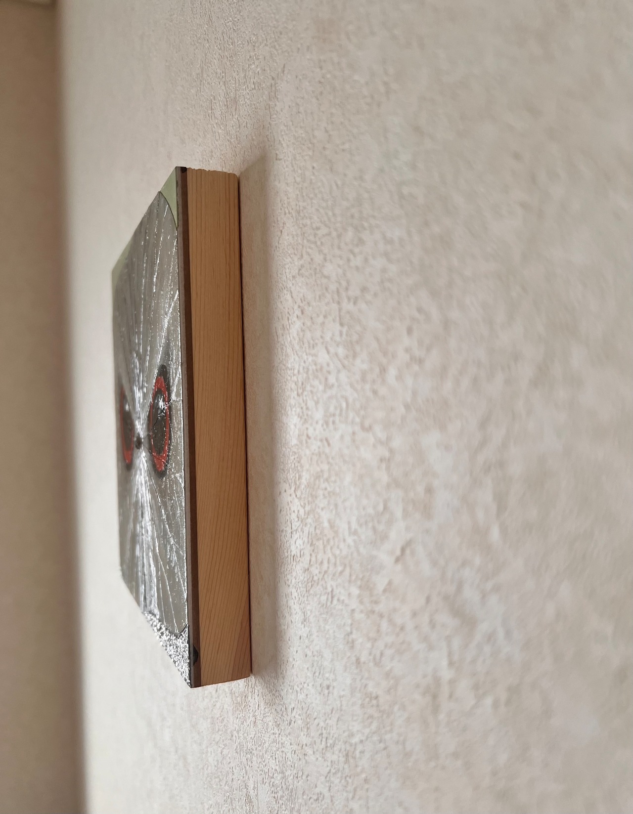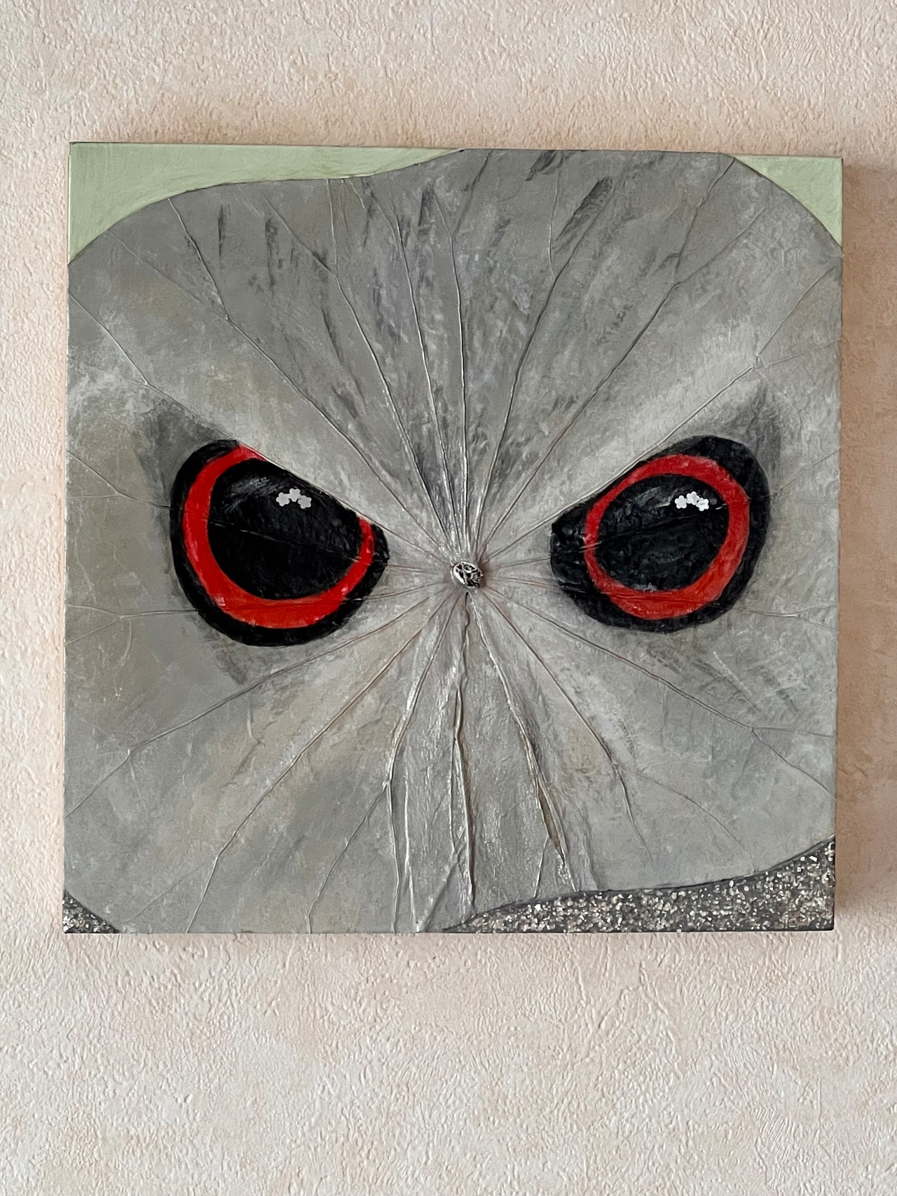 木製パネルに天然の蓮の葉を貼り、着色を施してます。