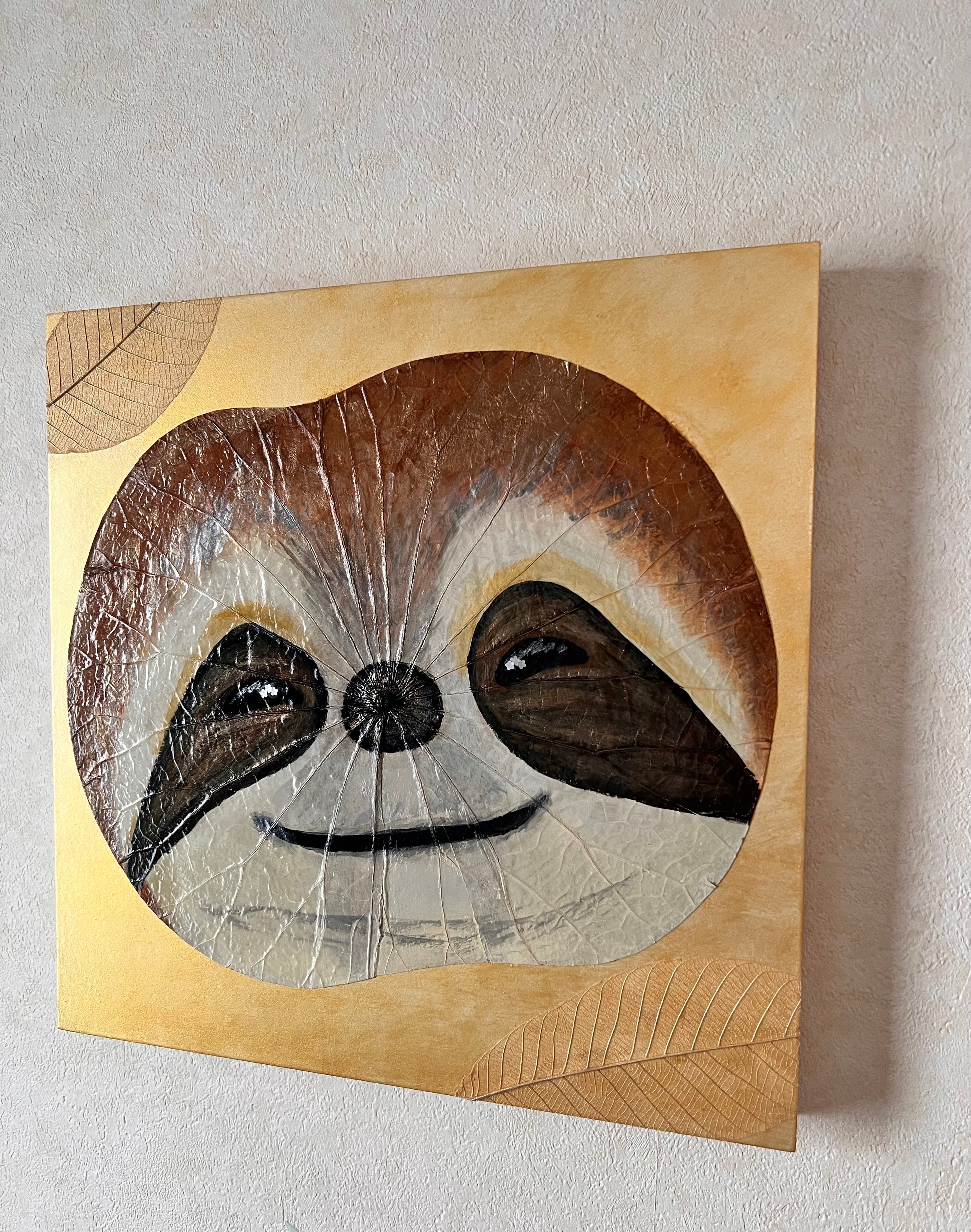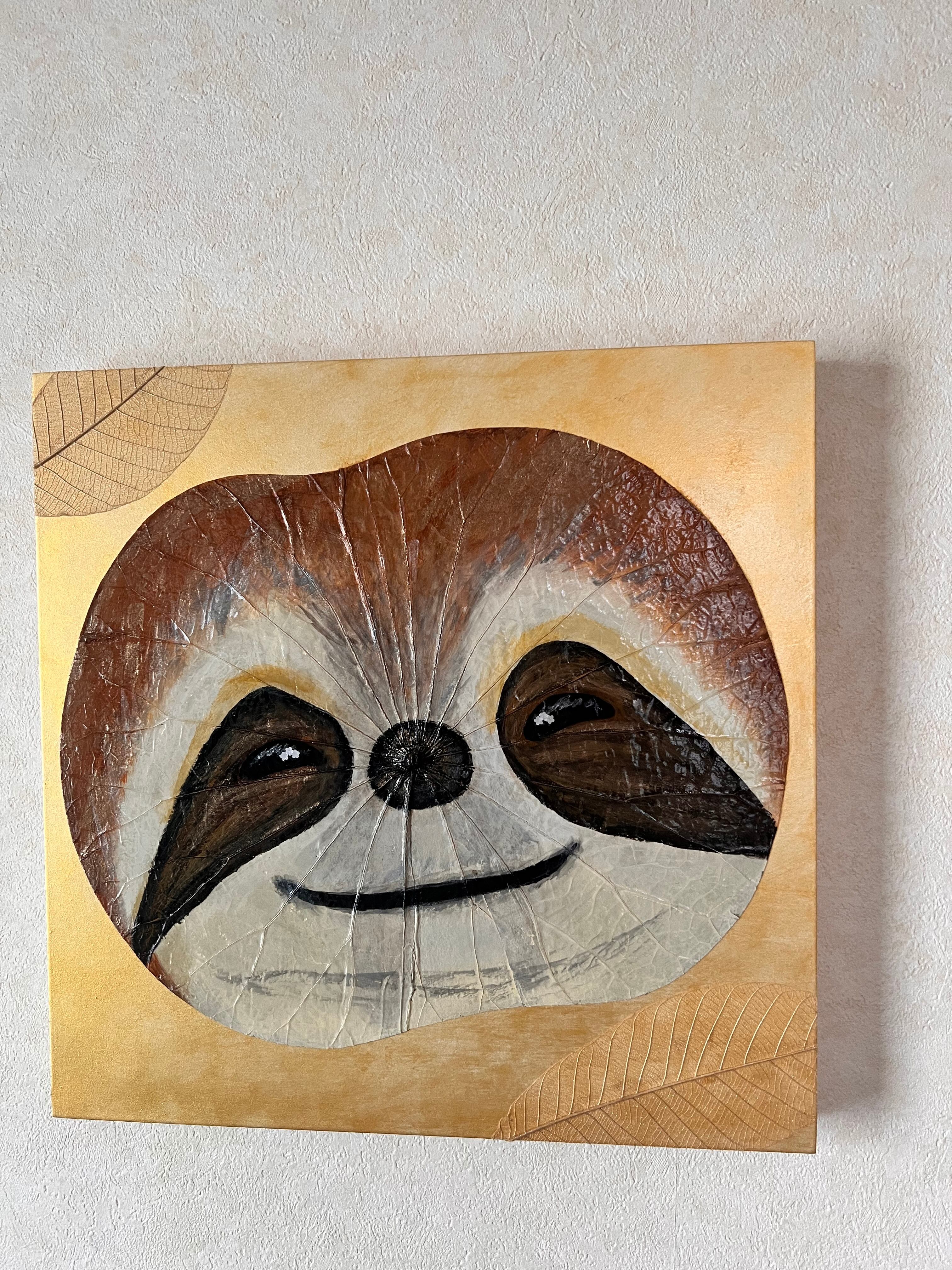 木製パネルに天然の蓮の葉とゴムの木の葉を貼り、着色を施してます。