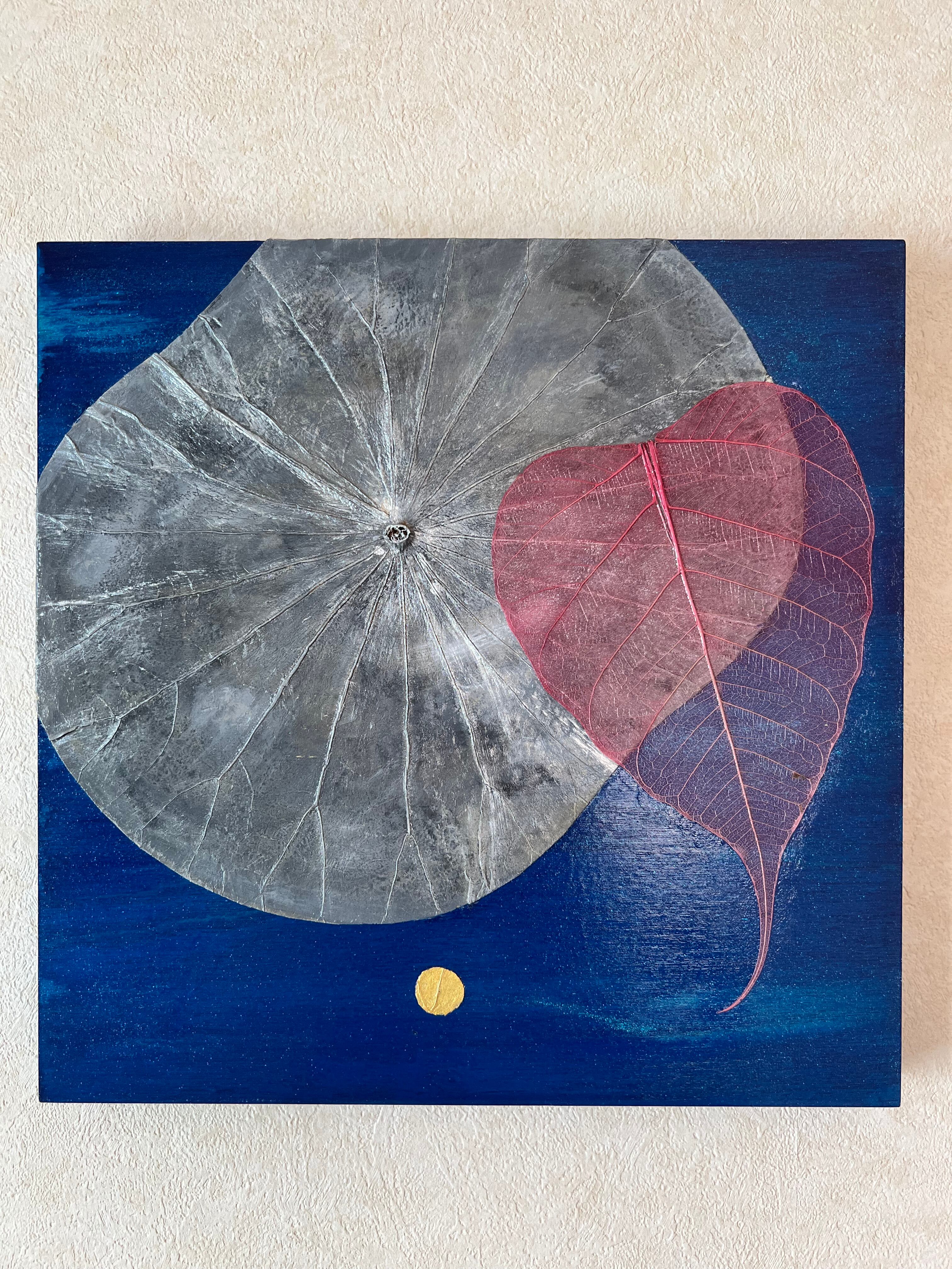 木製キャンバス地に天然の蓮の葉と菩提樹の葉を貼り、着色を施してます。