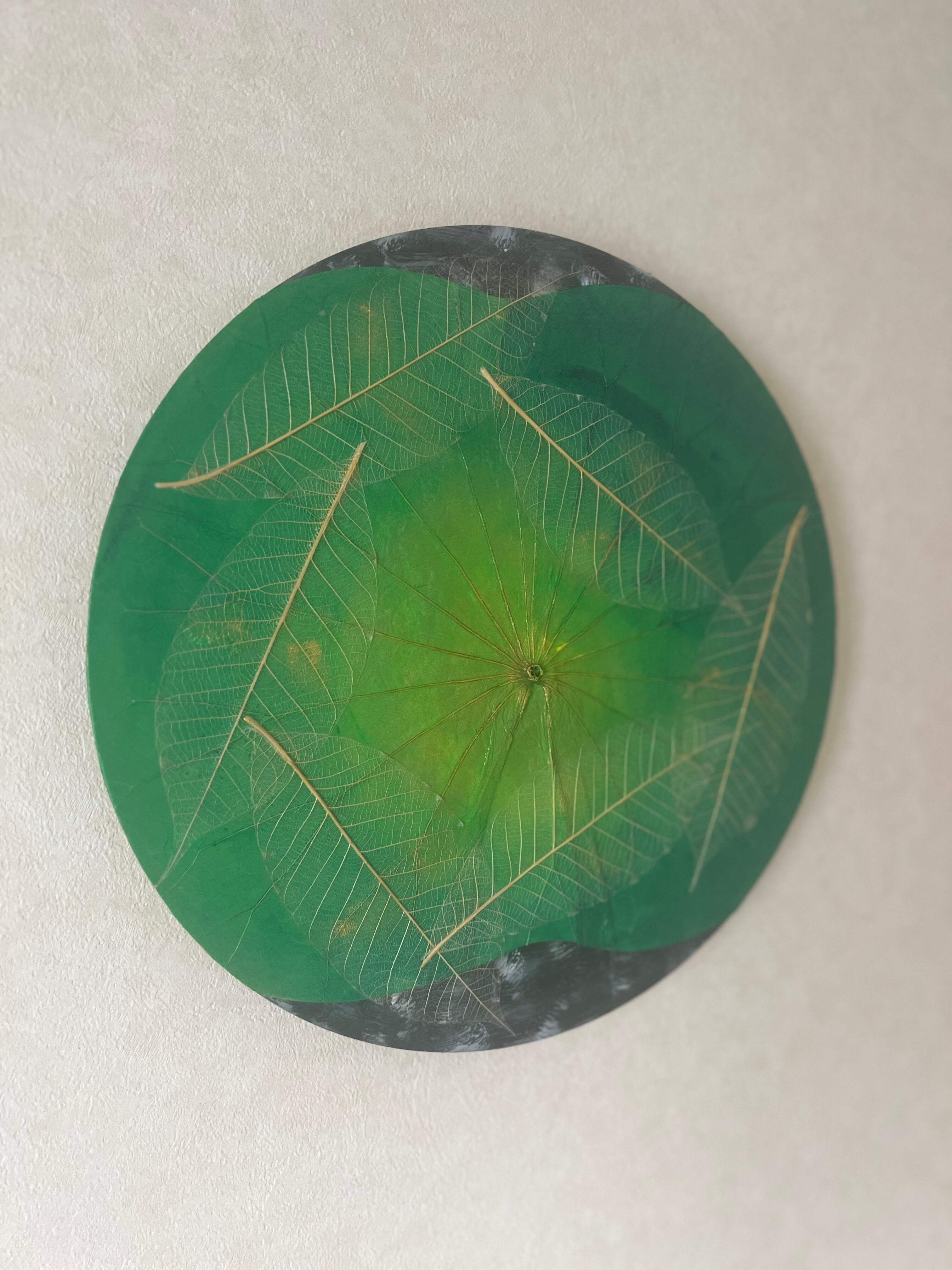 木製キャンバス地に天然の蓮の葉とゴムの木の葉を貼り、着色を施してます