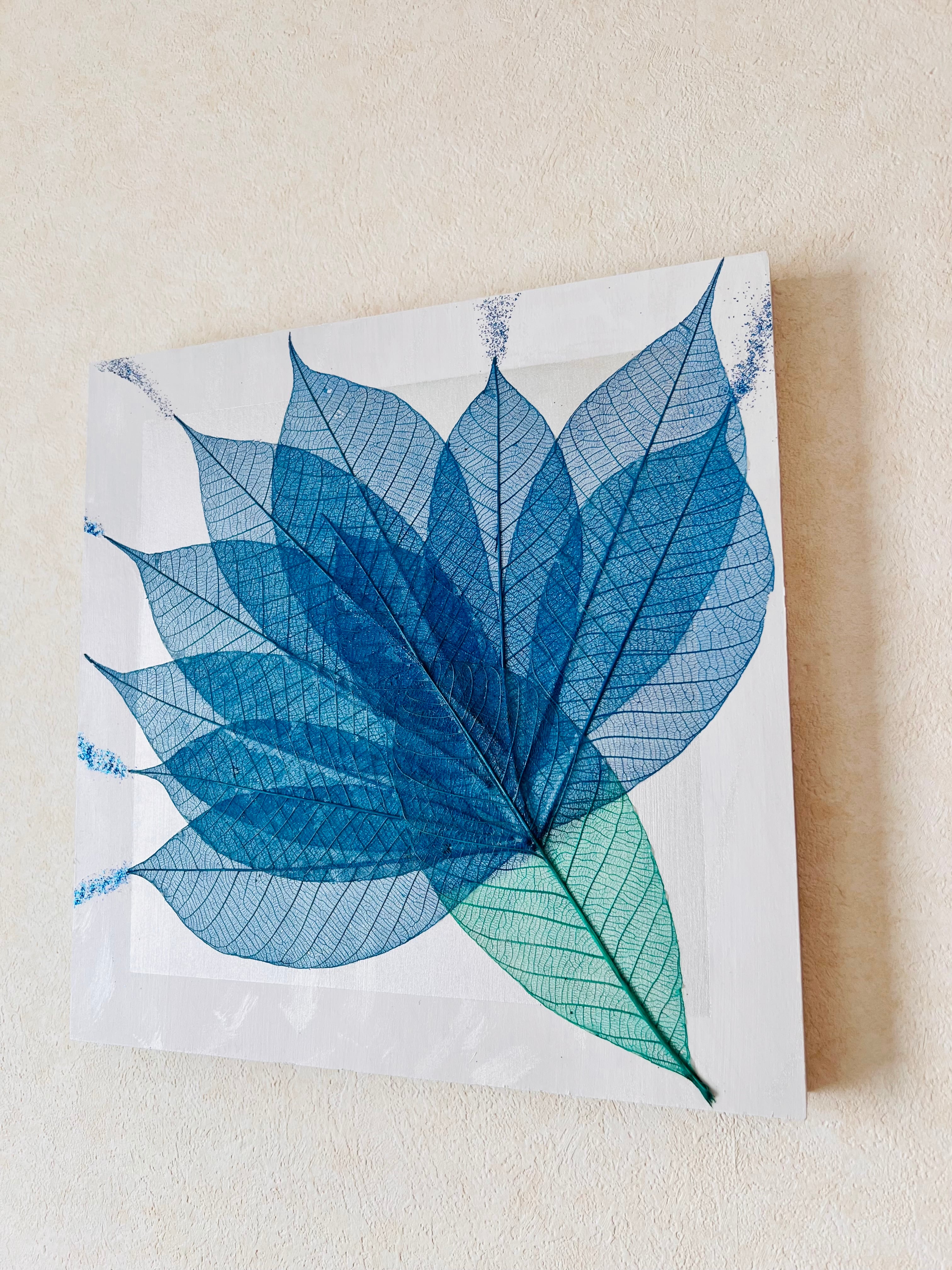 木製キャンバス地に天然のゴムの木の葉を貼り、着色を施してます。